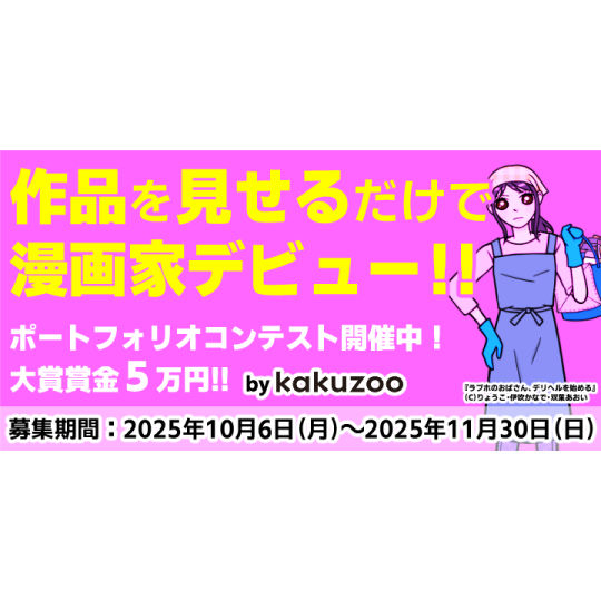 紹介文: 多くのマンガ家をデビューさせてきた名物コンテスト kakuzooの ポートフォリオ募集キャンペーンを開催! 過去の作品をまとめたポートフォリオを応募するだけで参加できるコンテストです。 オリジナル、二次創作、ネームなどなど…内容はなんでもOK! 編集部がポートフォリオで審査します。
