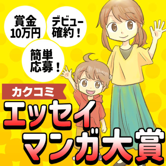 紹介文: カクコミが主催する、エッセイマンガ家を発掘するマンガ賞です。入賞者には担当編集がつき、各電子書店での連載を目指します!あなたも、カクコミでマンガを作りませんか?